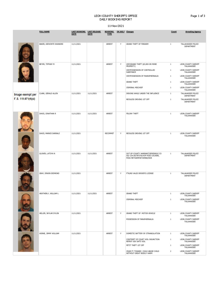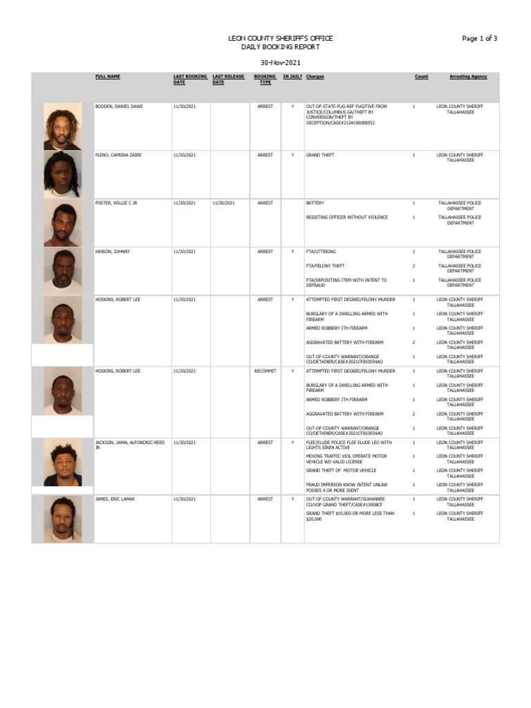 Leon county booking report november 1 2019 0 ratings0 found this document useful 0 votes11K views2 pages FULL NAMELAST BOOKING DATELAST RELEASE DATEBOOKING TYPEIN JAILCharges CountArresting Agency COOK STACI SHEVON 11212021ARRESTYPETIT THEFT1TALLAHASSEE POLICE DEPARTMENTDAVIS SANTRAY. TERRORISTIC THREAT OF FAMILYHOUSEHO. Leon County Booking Report.